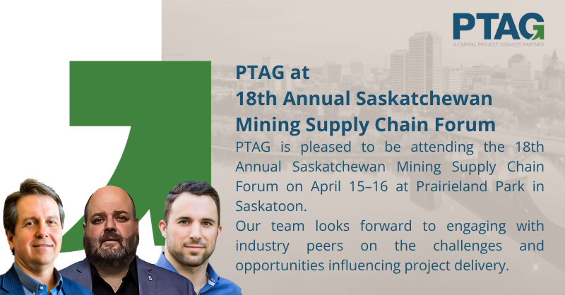PTAG is pleased to be attending the 18th Annual Saskatchewan Mining Supply Chain Forum on April 15–16 at Prairieland Park in Saskatoon. Representing PTAG at this year’s event are Andrew Grant, Andrew Dubreuil, and Ugo Santone, who bring deep expertise across project controls, construction management, and integrated project delivery.
